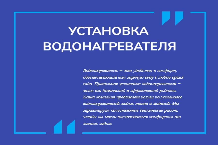 - Гарантия на выполненные работы. Мы уверены в качестве своих услуг и предоставляем гарантию на все выполненные работы. Если в течение гарантийного срока возникнут какие-либо проблемы с установленным водонагревателем, мы оперативно устраним их без дополнительных затрат для вас.
